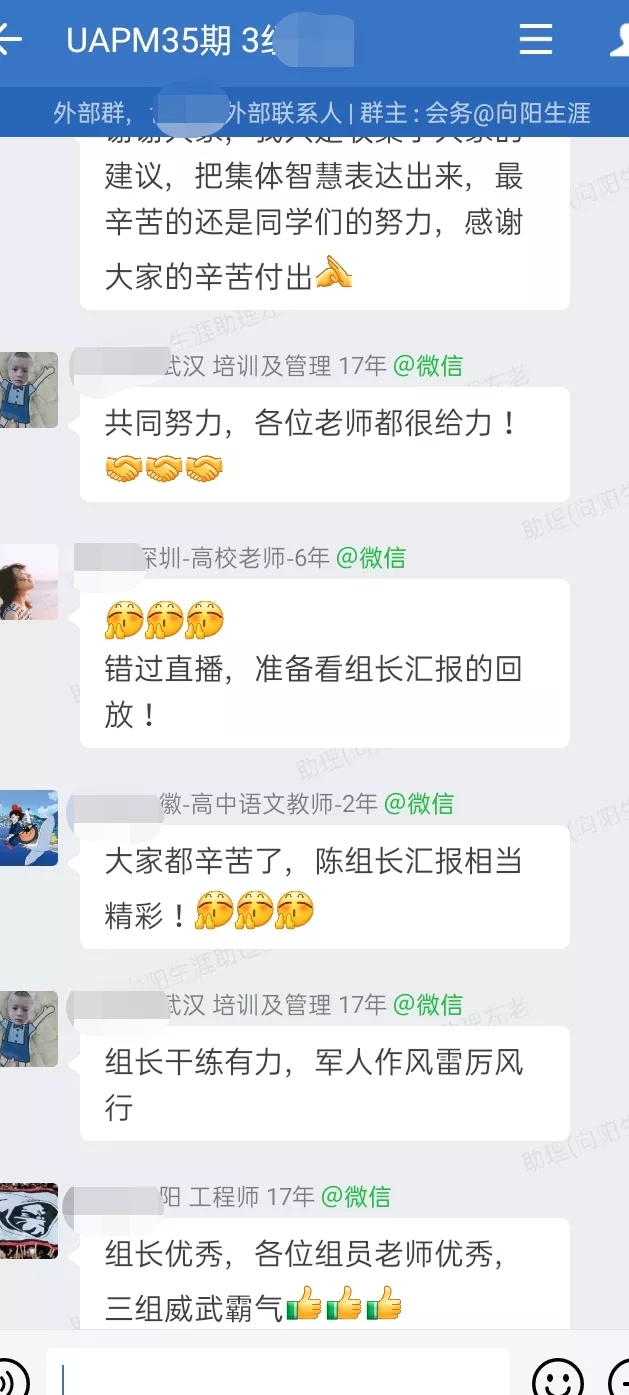 真心为每一位学习的老师感到骄傲,你们在年底百忙之中挤出时间参加课程,有的老师家庭工作要兼顾,只能利用晚上孩子入睡的时间来投入学习,好几次看到有老师在夜里12点还在提交打卡作业,甚至有的因为加班错过了研讨会,又在晚上大家入睡时出现在群里,发言参与讨论......
