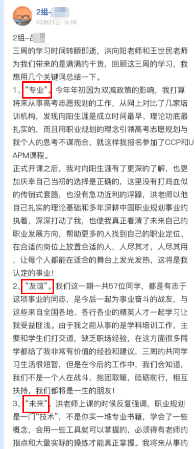 3周的时间,我们能够看到过往的师兄师姐们学习后的蜕变和成长:他们从一名职业规划的小白,成长为能够灵活运用职业规划理念技能的生涯规划师,助力于自己的生活和工作,实现了他们助人助己的目标!