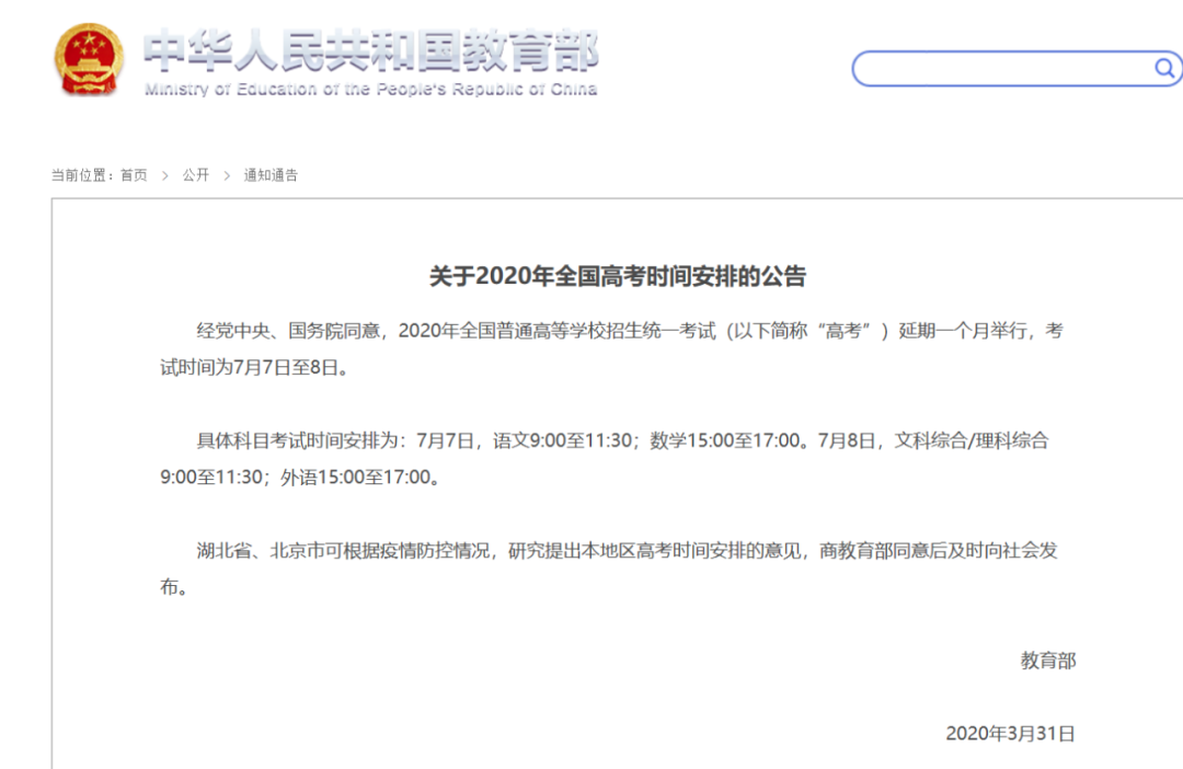 今天,教育部正式发布公告,确认了2020年高考延期的消息。